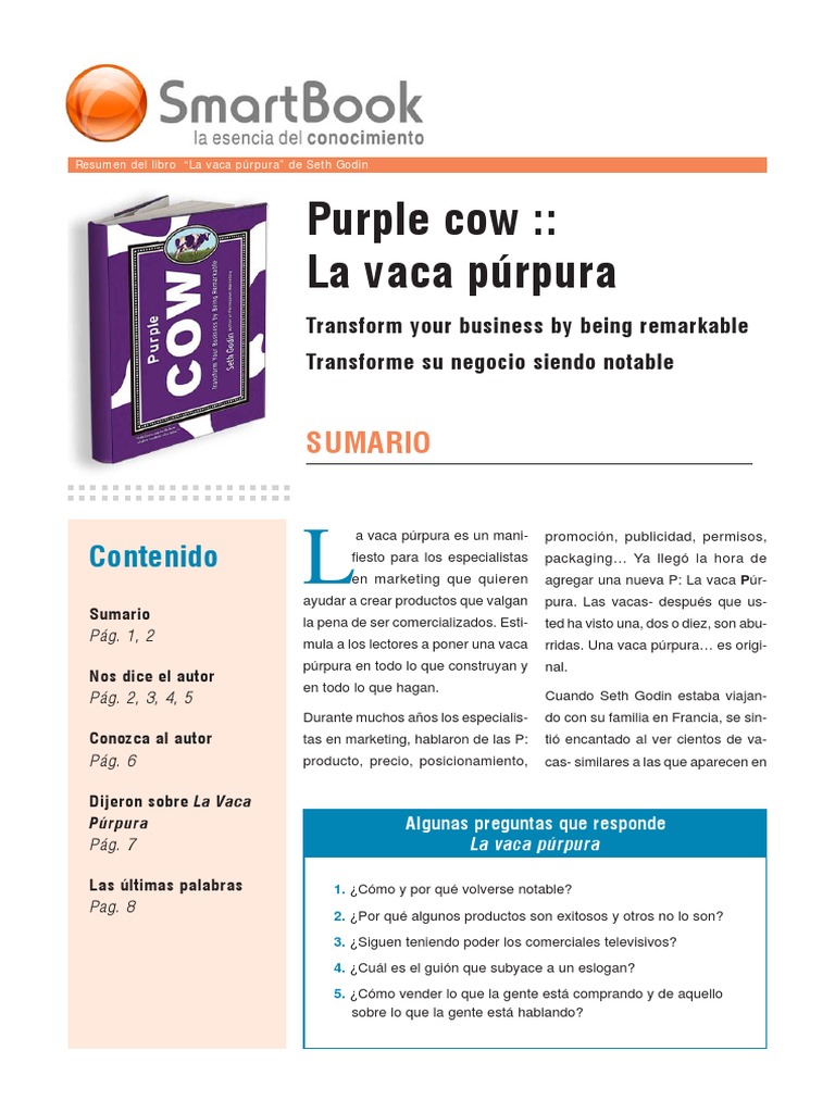 Proyecciones, beneficios y la vaca púrpura. La vaca púrpura algo excepcional nuevo interesante centrado en el nicho algo en lo que se fije la gente marketing :: Resumen del libro la vaca púrpura de seth godin purple cow : Lunes 30 de noviembre de 2009. Pdf l la vaca púrpura (pequeña guía) ~ mundokraker.com : Las viejas prácticas tan bien aprendidas durante años han dejado de funcionar porque han saturado los medios de comunicación y la mente del consumidor. Diminuer la taille de votre fichier pdf, tout en conservant la meilleure qualité possible. Descarga gratis la vaca púrpura en pdf. Vaca púrpura sea extraordinario y transforme su. View la_vaca_pãºrpura.pdf from física 12345 at universidad de córdoba. Un libro destinado para expertos en temas relacionados al marketing. La vaca púrpura algo excepcional nuevo interesante centrado en el nicho algo en lo que se fije la gente marketing :: Cargar archivos pdf más similares.